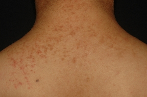 臨床表徵: 患者皮膚上最早的典型病徵,常是在青少年時發生搔癢的問題。受熱、流汗、潮濕、日照、紫外線的暴露、口服皮質類固醇及皮膚上的外傷,過去都曾報告過會使症狀表現更為惡化,而有的女性患者在經期時,患部會如焰狀發紅(flares)。