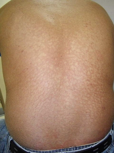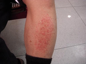| 缺脂性濕疹(asteatotic eczema) 缺脂性濕疹又稱為龜裂性濕疹(eczema craquele),主要發生於小腿,因為乾裂引起如瓷器般的裂紋,嚴重時也會侵犯上臂、大腿前側及下背部。缺脂性濕疹的成因以體質為主,另外老化、疾病、營養不良、賀爾蒙下降、清潔過度、摩擦過度、環境溼度過低、熱水澡、冷天,外用類固醇,藥物,尤其是標靶化療用藥都是常見原因。另外皮膚的急性水腫,也會引起同樣症狀,甚至產生出血現象。 依成因Caplan將局部的缺脂性濕疹分為以下幾類 1. 老年人因老化、乾燥脫水、營養不良(鋅, 必需脂肪酸)於下肢產生 2.因清潔劑過度使用引起的刺激性皮膚炎 3.類固醇停用 4.神經疾病引起局部排汗減少 至於全身性缺脂性濕疹則要考慮內分泌(甲狀腺)、藥物(antiandrogen, diuretics, target therapy)及惡性腫瘤。惡性腫瘤引起的個案,在統計上這類患者除癌症的不適外,範圍較廣、發炎較為明顯、對類固醇反應較差,此外血中鋅較低,容易貧血,出現生物性發炎徵候群(CRP >15 mg/L, haptoglobin >1,2 G/L, ESR提高)。除了本身發炎外也會因傷口的存在而增加過敏及刺激性皮膚炎的可能。 治療上主要是要找出主要的惡化因素,加以避免,使用保濕劑及適量的類固醇塗抹。 |