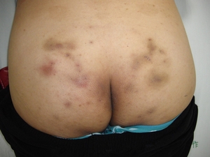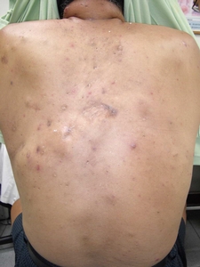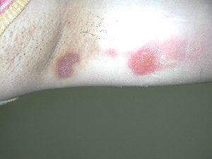 化膿性汗腺炎又稱為Verneuil disease是一種不明原因的頂漿腺慢性發炎疾病,盛行率推測為1%,肥胖及抽煙是重要惡化因素,Down syndrome患者發生率較高,另外局部病灶則有IL22缺乏及IL32上升現象,部份殺菌蛋白分泌減少(BD1~3, S100A7~9),但頂漿腺, 遠端毛囊上皮, 及表皮分泌殺菌蛋白LL-37增加。常於青春期開始出現,一般發生在雙側腋下及鼠蹊部的深層結節,除肛門病灶外女性較多,之後形成化膿及增生性疤痕,化膿通常是無菌性發炎,但也可能會有續發性的細菌感染,而引起淋巴結腫大,病程反覆,約每2~4週惡化一次; 若嚴重發炎而產生大的膿瘍,則可能造成日後形成流液竇或是瘢痕組織。有化膿性汗腺炎的病人,有機會同時發生嚴重的的囊腫型痤瘡。早期多以抗生素治療,或是飲食療法(a healthy and fully natural zero dairy and low glycemic–load diet )慢性期治療包括抗生素(如RIF 300mg bid+ Cleocin 300mg bid 10周,也可以Minocin 100mg取代,對會陰病灶尤佳),口服或注射類固醇,雌激素,抗雄激素(CPA), spironolactone及維生素A酸(acitretin, isotretinoid), dapsone, colchicine及手術切除。嚴重患者可嘗試完全切除補皮、光動力療法、Nd:YAG除毛雷射、放射線治療或生物製劑如Enbrel, Humira治療。在發表的文章中,在16周時已humira 40mg隔週或是每周注射,9.6%及17.6%可達療效,但嚴重副作用發生比則為5.8%及7.8%. anakinra也有使用報告 |