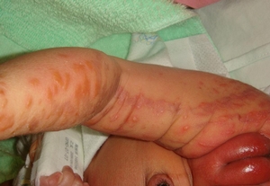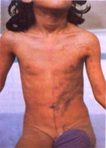 色素失禁症。色素失禁症是一種罕見的皮膚遺傳疾病,通常發生在女性,可能會有皮膚以外的表現,抱括眼睛,牙齒,骨骼,以及中樞神經系統的異常,以皮膚表現最多牙齒其次。皮膚表現可分為四個時期: 剛出生看到皮膚線條狀發炎水皰,水皰破後皮膚增厚,呈條狀或片狀黑斑,最後色素退化變白斑,其中第三期最常見,第一其次之。有少數患者並無明顯水疱期,此時要與線狀及漩渦狀母斑樣色素沉著症(linear and whorled nevoid hypermelanosis)作鑑別。 |